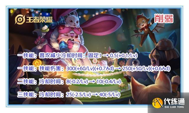 一技能:每次普攻降低的冷却时间从固定的1秒调整为0.5/0.6/0.7/0.8/0.9/1秒。并且技能伤害从300/360/420/480/540/600+70%ap加成调整为250/300/350/400/450/500+60%ap加成。二技能:冷却时间从原先的8/7.8/7.6/7.4/7.2/7秒调整为10/9.6/9.2/8.8/8.4/8秒。三技能:冷却时间从原先的25/22.5/20秒调整为40/35/30秒。简单地说就是一技能在降低伤害的同时,还对被动减cd做出了限制;二技能和三技能则主要 是对技能的cd时间做出调整。