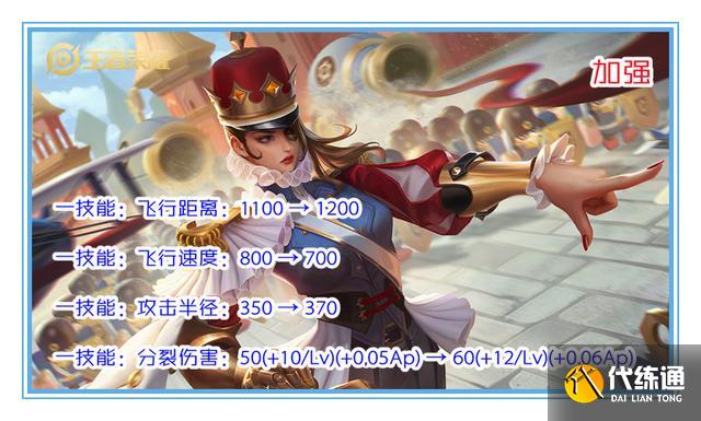 飞行距离从1100码增加到1200可以让她的一技能能打到更多的人一技能的飞行距离从800调整到700,这样有好有坏。好处是技能能够打的伤害更多了,坏处是比人更好躲了。一技能的攻击半径从350增加到了370,这个调整和飞行距离一样,也是让米莱狄的一技能可以打到更多的人。一技能的分裂伤害从原先的50/60/70/80/90/100+5%ap加成调整为60/72/84/96/108/120+6%ap加成,这个调整确实增加了米莱狄一技能的伤害。⑵我对米莱狄调整的看法