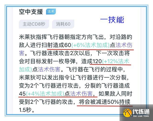 基础伤害是60+6%ap加成飞行器连续攻击两次后会发射一枚导弹,导弹可以造成120+12%ap加成的法术伤害米莱狄还可以手动让飞行器分裂,分裂的飞行器造成45+4%ap加成的法术伤害大家发现没有,即使米莱狄一技能的攻击距离、攻击半径再怎么增加,她原本的伤害就在这里,要想充分发挥她一技能的效果,我们就要为她搭配痛苦面具或者黄色打野刀这样的特殊功能装。