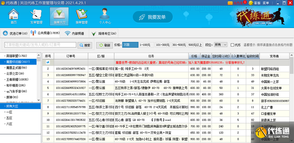 魔兽世界代练行业也已经成为了一个新兴行业,年轻人都开始接触游戏,也养活了很多以此为生的私代以及代练工作室,而现在的代练市场,充斥着各种各样的代练相关软件,其评价褒贬不一,今天给大家说一说最火的一个代练平台软件:代练通: