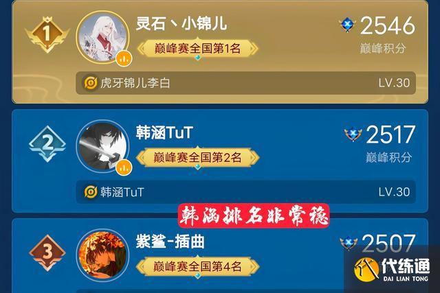 北慕巅峰赛一周没进前十,竟被国服李白拿了第一,韩涵排名真的稳
