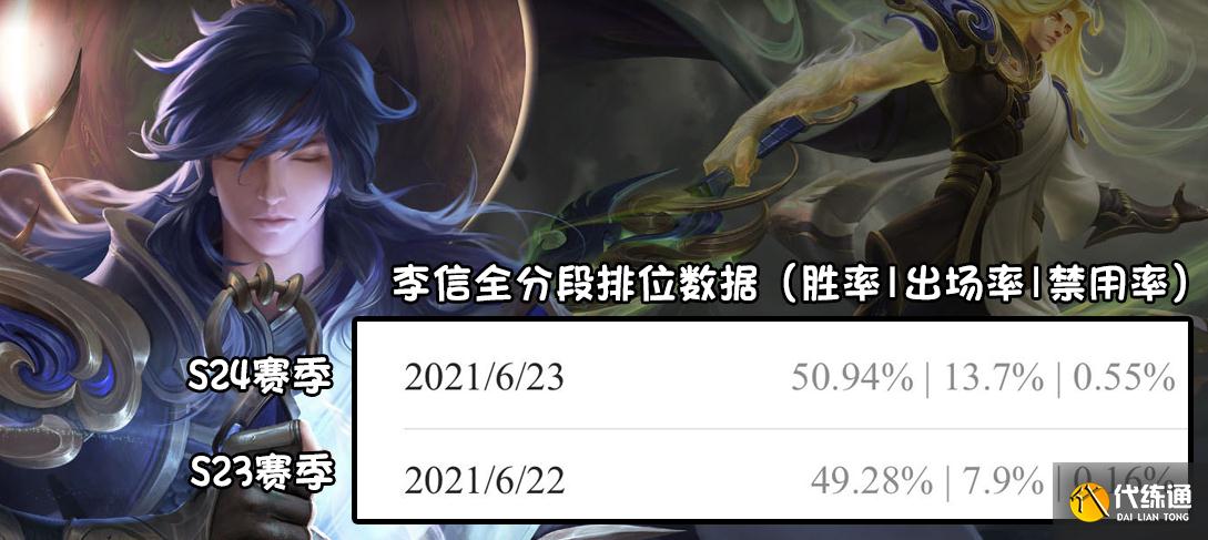我们可以看到,在这次调整之后李信的胜率以及出场率都有所提高,具体原因我认为是由于线上问题修复的关系,使他的总体强度都有所提升。而且反甲也受到了调整,局内出反甲的英雄明显下降了许多,这或多或少也提高了他的伤害,但也有部分原因是因为热度导致。