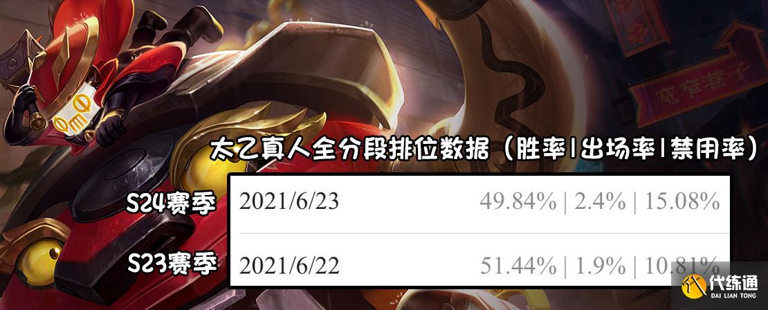 可能是因为控制时长下降的关系,太乙的线上强度也因此受到了影响,这也导致他的胜率下降了一些。
