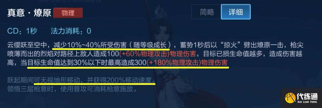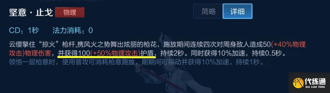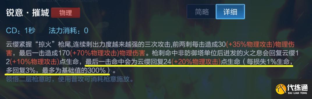 一层枪意算得上使用最频繁的技能了,别忘了云缨的被动技能,使用枪意之后,会恢复1/2技能1.25秒的cd,换句话说,1a2a,那么会比12a的冷却速度更快,且四次伤害都能触发法球效果,自身增加护盾可以无伤清兵清野,还能触发吸血效果,因此非打架状态建议使用一层枪意刷野清兵。