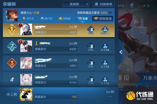 现在新赛季刚刚更新一天的时间,就已经有部分玩家达到了国服第一,而且现在在国服榜单上面,已经有4位玩家成为国服,玩家最高的战力已经达到了4520,这也是新赛季更新一天的时间达到的成就,不得不说有些玩家还是真的强,本来新赛季更新的时候,就因为bug的原因导致推迟,而依然有玩家,在很短的时间就已经达到了国服,这4位国服玩家都已经有4000以上的战力。