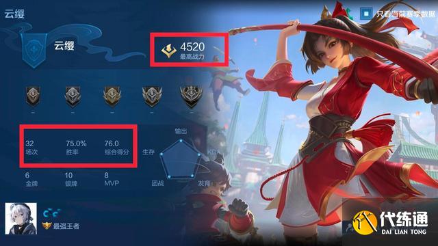 而目前在国服第一的云缨玩家的胜率已经达到了75%,这对于在新赛季初的时候还是非常难的,我们都知道新赛季上分很难,尤其是段位越高的玩家上分可能会更加的难,因为大家都在争抢着到达王者段位,而国服第1玩家打了32场云缨,依然保持了75%的胜率,并且获得了10次银牌和6次金牌,还有8次MVP,占到一半的场次都能够获得金银牌,可以看出云缨还是挺强的。