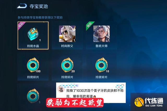 首先在这个玲珑夺宝系统中有玩家反映,自己感觉这个中奖率真的是太低了,本来奖励就不是特别的丰厚,这个中奖率还和荣耀水晶差不多,我们在抽荣耀水晶的时候,时不时也能够中一个永久皮肤或者是英雄之类的,但是在这个玲珑夺宝系统中,玩家抽了1030次,竟然还没有获得一款皮肤,而且这款皮肤的价值只有28个皮肤碎片而已,这个中奖率实在是太感人了。