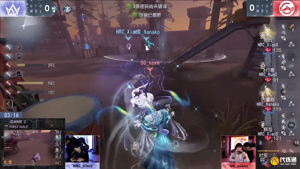 第二天,成都GG vs MRC第二局上半局,GG_xawm时空之影劣势翻盘,开门战三人三抓:GG_xawm时空之影开局在起点站追击古董商,利用异族本相涨侵蚀度拿到第一刀,后期古董商利用祭司的洞上鬼屋二楼,GG_xawm伊斯人和本体夹击,本体压迫古董商下楼后伊斯人寄宿产生陶片,但GG_xawm传送陶片失误,错失了击倒机会,古董商在祭司辅助下来回过河,又绕回起点站,被击倒挂上椅后密码机进度已接近四台。佣兵救下古董商后,祭司已到位打大洞辅助,GG_xawm及时用伊斯人寄宿古董商,二阶传送落地成功打断打洞,击倒古董商,有惊无险将古董商挂在遗产机。古董商被二次救下后未飞轮,在密码机压好前一秒被击倒,时空之影千钧一发将其淘汰。GG_xawm控制伊斯人在终点飞行家处留下陶片,拉回后换位,本体在终点站追击飞行家,伊斯人控起点门。MRC求生者不着急点门欲拖挽留时间,压迫感非常强。但是GG_xawm技能精准释放,快速叠满侵蚀度,击倒祭司,挽留时间已过祭司淘汰进度刚好过半,飞行家救下祭司后被击倒,祭司被再次击倒淘汰,倒地飞行家此时仍在时空之影附近。GG_xawm根据耳鸣判断佣兵来过,不紧不慢闪现蓄力刀稳健将飞行家击倒在地窖旁完成三抓。
