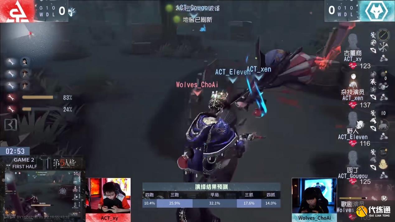 第二天,ACT vs 成都Wolves,第二局上半局,ACT_Eleven野人逆转局势协助队友三出:Wolves _ChoAi选择了挽留封窗、传送带到底的天赋,挂上ACT_xen杂技演员后,ACT_Eleven野人吸引歌剧演员深追, ACT_Gougou园丁无伤救下杂技演员,杂技演员下椅后和歌剧演员拉开身位进入板区,额外牵制了半分钟。杂技演员被击倒后,密码机进度只差一台,ACT_Eleven野人及时赶到,歌剧演员本想极限距离强挂遗产机,被野人拱开后ACT_xen杂技演员挣脱,野人又换角度再将歌剧演员拱向空地,杂技演员直接转到大门,歌剧演员被迫放弃追击杂技演员进行控场。最后来到开门战,ACT_Eleven野人牵制到上猪。歌剧演员无法将其终结,传送小门击倒杂技演员,挂上后回溯赶往大门,但求生者已三出。