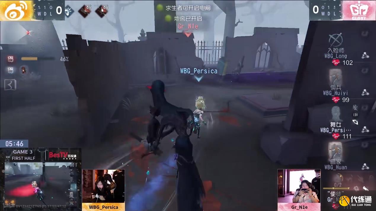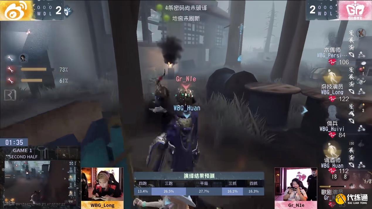 第三天,Gr vs WBG第一局下半局,WBG求生者接力牵制歌剧演员完成三出:开局歌剧演员在小木屋追击WBG_Long杂技演员,虽有插眼,WBG_Long选择在长窗处牵制,预判歌剧演员回溯,翻窗后迅速跳球回木屋,极限规避隔窗刀,后多次博弈歌剧演员回溯,被极限隔窗刀后放板,再次交球翻窗极限躲刀离开木屋转入中场,WBG_Huan双弹飞轮调酒师辅助牵制,成功扛刀,吸引歌剧演员换追。WBG_Huan使用加速酒并飞轮进板,同时预判歌剧演员蓄力刀预判飞轮,灵性回身下板躲避刀气,利用攻击后摇翻板回满状态,一路牵制回木屋,密码机进度接近三台半。WBG_Huiyi佣兵及时赶到,交护腕救下人,歌剧演员想换节奏控场争胜,逼完佣兵护腕追双倒,放弃调酒师,将佣兵挂在中场遗产机。WBG_Long杂技演员在大房新起,歌剧演员命中佣兵后又想追击半状态杂技演员。WBG_Long杂技演员如出一辙再次在长窗处牵制,多次躲刀不给机会,被击倒时WBG_Huan调酒师在木屋新起的密码机已压好。WBG_Persica木偶师及时救下,开门战牵制拖到门开。歌剧演员击倒木偶师后传送管门已无力回天,逼走佣兵和调酒师,留下被排到耳鸣的杂技演员,木偶师点大门逃生完成三出。