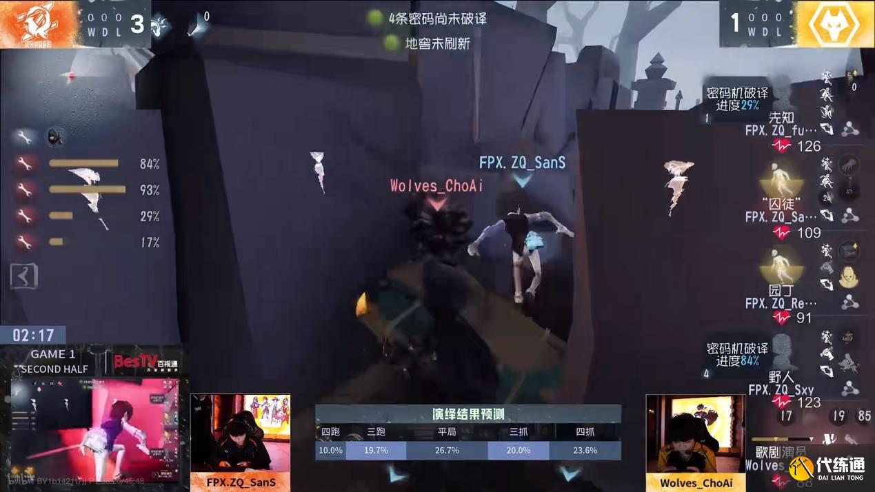 第三天,成都Wolves vs FPX.ZQ第一局下半局,FPX.ZQ_SanS囚徒压迫感博弈自如牵制全局:歌剧演员开局在墓地追击FPX.ZQ_SanS囚徒,FPX.ZQ_SanS选择先消耗板子和技能,配合先知的鸟在墓地及周边牵制,密码机进度一台半时吃刀,利用受伤加速拉开身位后,板前下蹲连电,不紧不慢刚好翻板成功逼出歌剧演员闪现,此时密码机进度约两台。歌剧演员在守椅战中选择多贪了一刀园丁,导致囚徒拉开远距离身位,转入小门双板区牵制,FPX.ZQ_SanS开始利用基本功博弈,多次预判回溯提前翻板,面对影域状态的歌剧演员,在短板区大胆翻板,牵制许久,甚至又在板后直接下蹲连电提高队友破译效率,再次被击倒时密码机进度只差半台,但四台密码机都未点亮。FPX.ZQ_SanS囚徒单人三次牵制到队友补完密码机,再次极限翻板拖到野人陪跑,被击倒时队友已贴门。开门战FPX.ZQ_SanS再次短板博弈成功,极限扭刀气走地窖完成四出。
