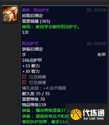 ⑤阳炎护手:大名鼎鼎的阳炎护手图纸掉落于太阳井高地,法系tbc版本毕业没有之一,53点法伤加2个红宝石槽,堪称完美,唯一美中不足的就是价钱太贵了,属于早买早毕业的装备。