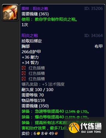 ⑥阳炎之袍:阳炎之袍图纸是不绑定的,但是做出来的装备是绑定的,所以想要拿到这件装备很多法系都选择了裁缝专业。当年刷太阳井高地小怪就掉落阳炎之袍的图纸,这图纸可以卖到1-2万金左右,在那个一张点卡还是3000金左右的年代,是一笔不少的财富了。阳炎之袍属于终极毕业装备,土豪玩家是一定会买的,普通玩家穿个t6衣服也是挺香的。