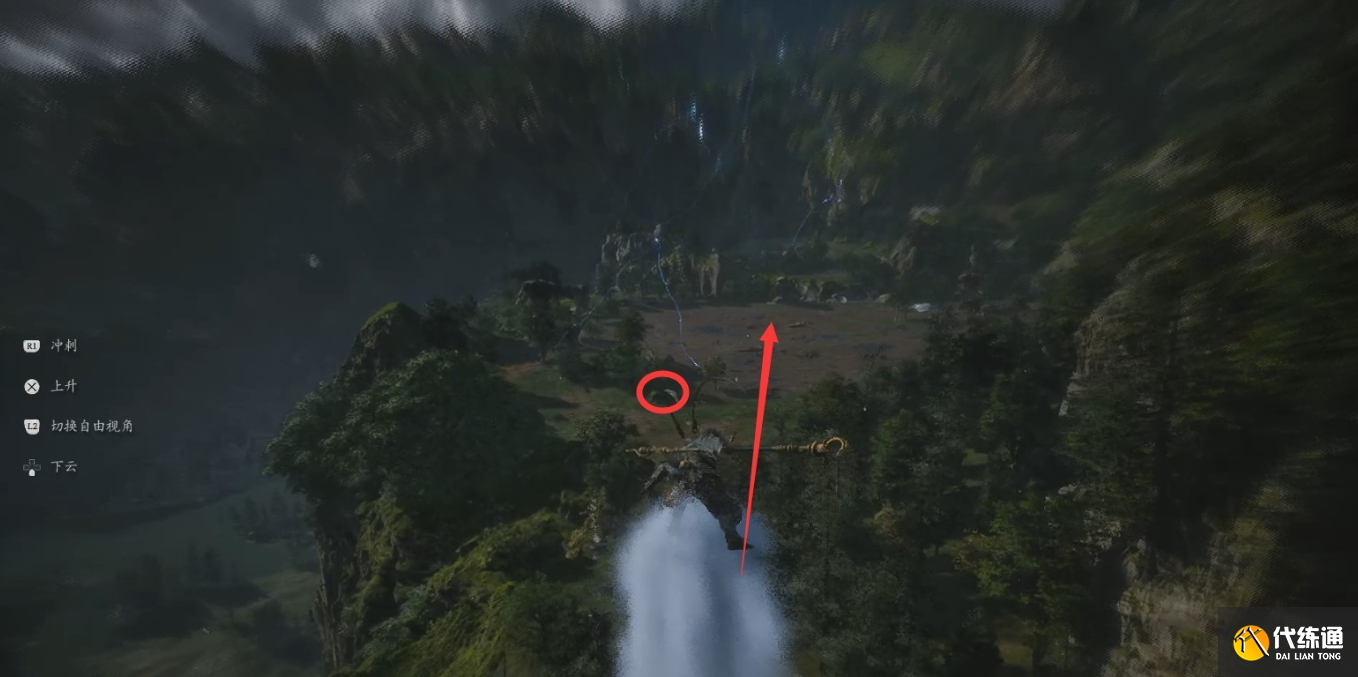 3、先乘筋斗云向前,看面前的正下方有个水池,落到水池里打跳浪蛟。然后我们会先去右边跟随猪八戒的脚步探索,最后再去左边探索。
