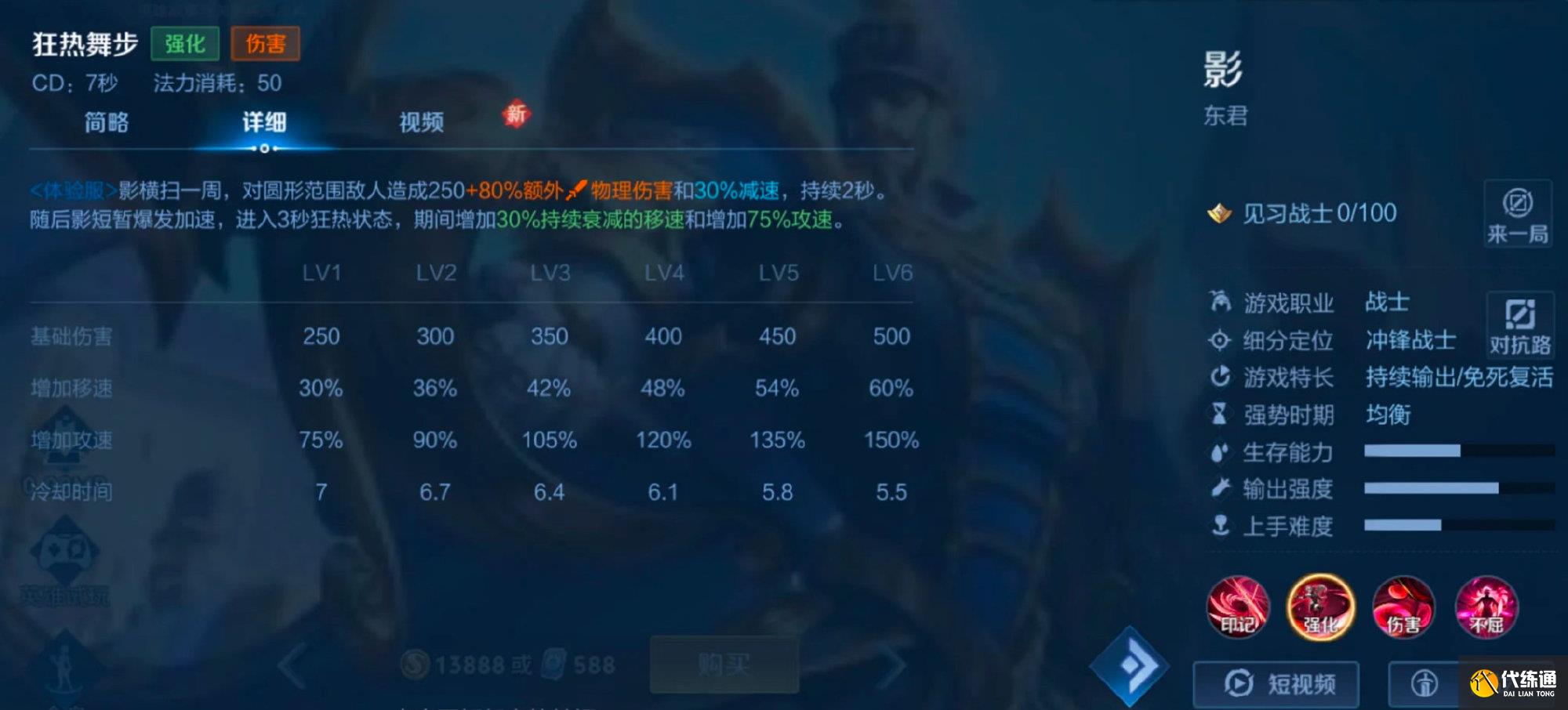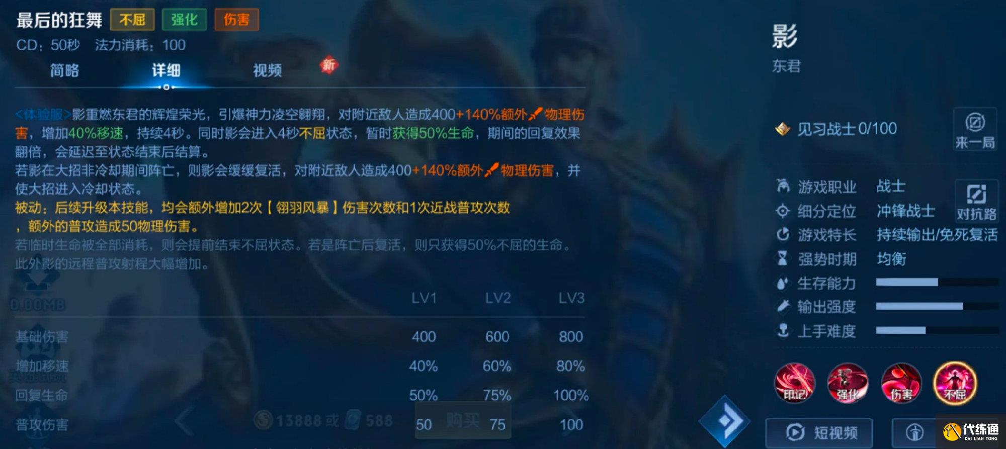 <体验服>影重燃东君的辉煌荣光,引爆神力凌空翱翔,对附近敌人造成400+140%额外物理伤害,增加40%移速,持续4秒。同时影会进入4秒不屈状态,暂时获得50%生命,期间的回复效果翻倍,会延迟至状态结束后结算。