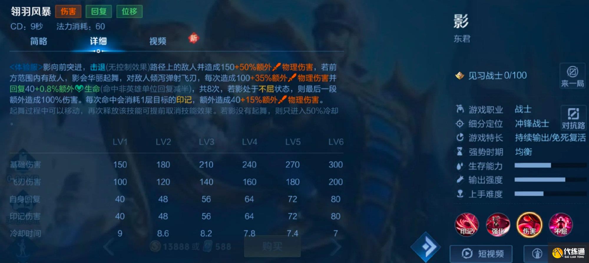 <体验服>影向前突进,击退(无控制效果)路径上的敌人并造成150+50%额外,物理伤害,若前方范围内有敌人,影会华丽起舞,对敌人倾泻弹射飞刃,每次造成100+35%额外,物理伤害并回复40+0.8%额外生命(命中非英雄单位回复减半),共8次,若影处于不屈状态,则最后一段额外造成100%伤害。每次命中会消耗1层目标的印记,额外造成40+15%额外,物理伤害。