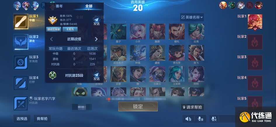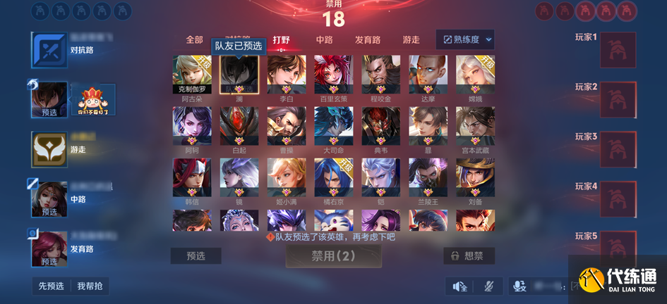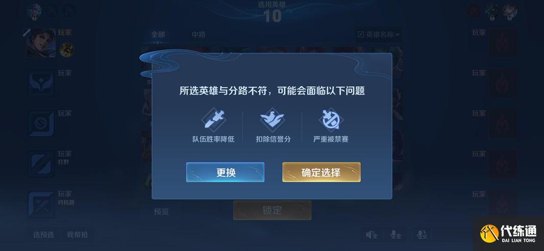 同阵营玩家同时选择英雄,可选择对应分配分路下的英雄;同时根据玩家使用情况,刷新了分路下的英雄对应关系。