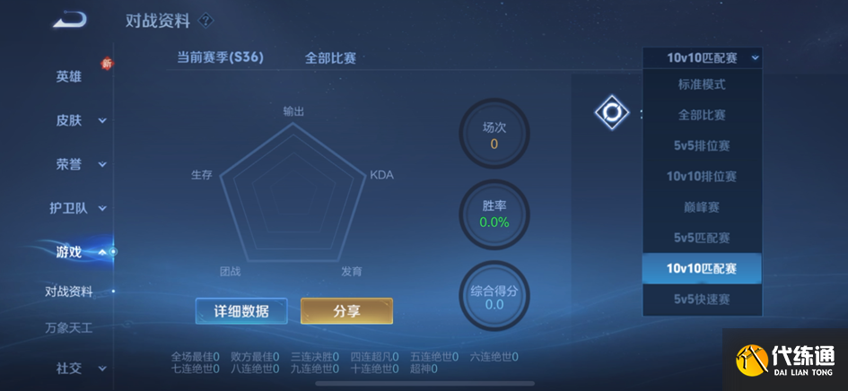个人对战资料数据新增10v10匹配、排位相关对局数据情况,大家可以通过对战资料内选择对应模式查阅自己的相关对局数据情况。