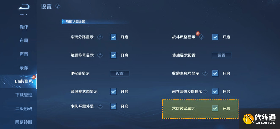 若关闭“游戏大厅”展示后,大厅界面将不再显示灵宝,此时可在“游戏设置——功能/隐私”中进行开启。