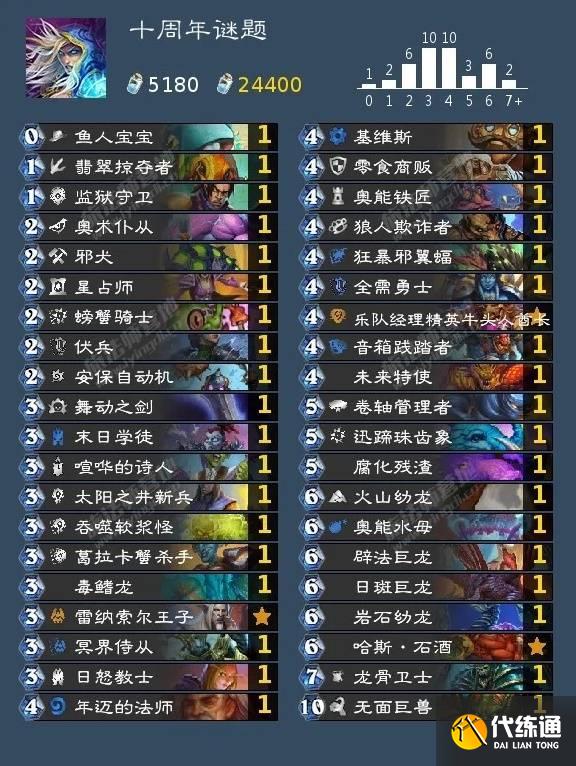 最后一题花了四个多月才被人破解完成,进入谜题的方法是携带上面这套特定的卡组匹配狂野天梯。这套卡组里的每一张卡牌分别代表了炉石传说不同的版本,需要注意的是,大部分的卡牌都不是免费的,可能需要自己合成,虽然都是蓝白卡,但是零零散散加起来也有一两千尘,完成之前首先要掂量一下自己能否承受这些粉尘的损失。
