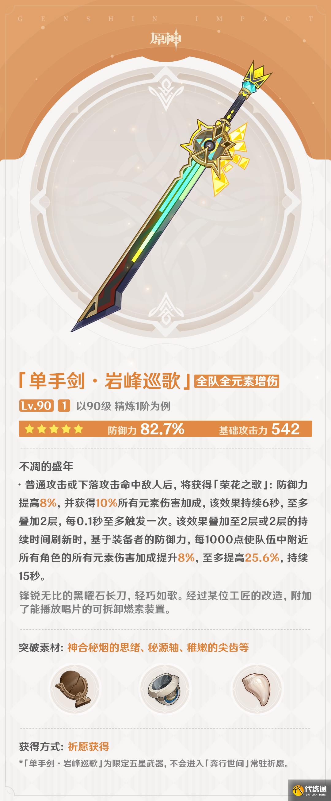 *「单手剑·岩峰巡歌」为限定五星武器,不会进入「奔行世间」常驻祈愿。