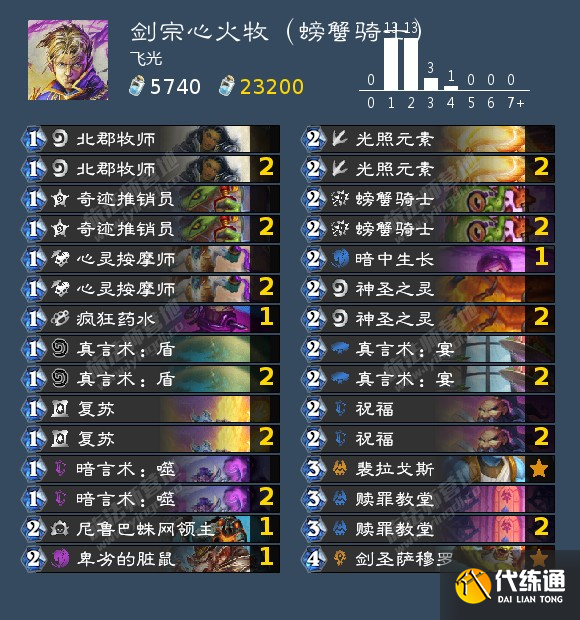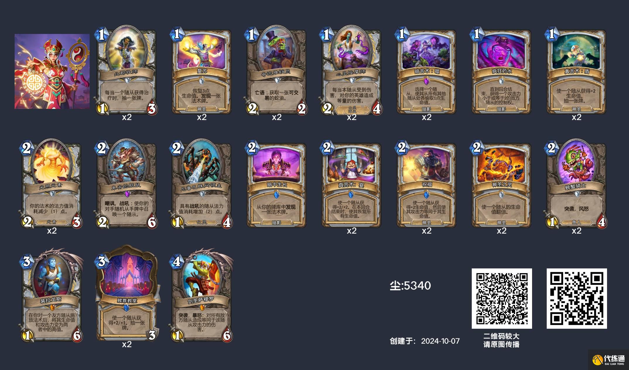来自飞光的一套剑宗心火牧,他使用这套卡组在上个月末以80胜率上传,笔者使用这套卡组进行了小改动后10月1日3小时打到钻二(速度奇快)。