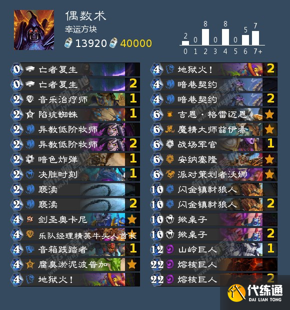 来自幸运方块的偶数术,他使用这套卡组以53场72%胜率打上了传说。
