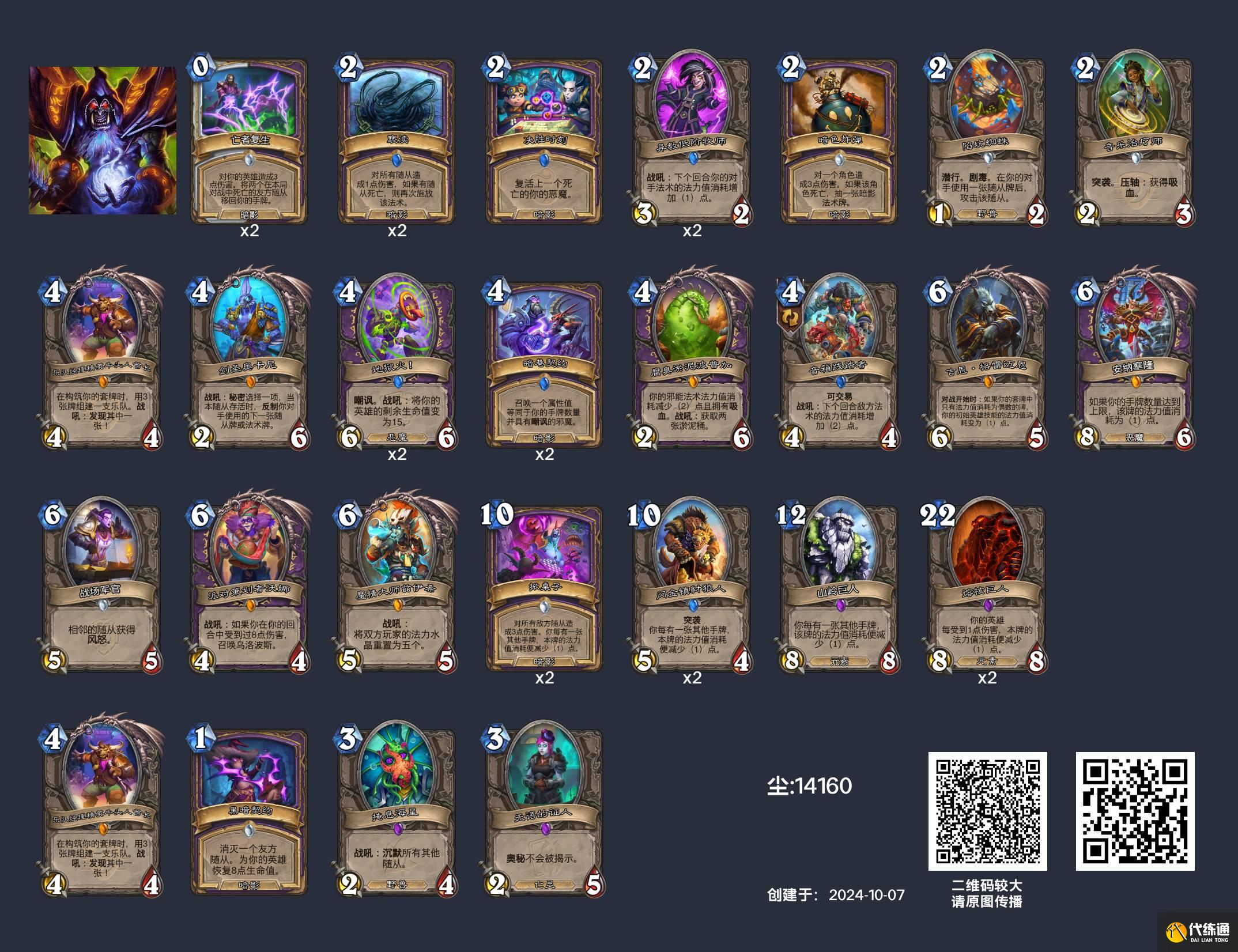 坑陷蜘蛛,剑圣奥尼卡,小塞布中塞布应对冲锋德、心火牧;亵渎、掀桌子、地狱火!应对暗牧海盗瞎;对阵慢速卡组要保持坟场纯净,连续施压,现环境慢速基本解不完这么多巨人。