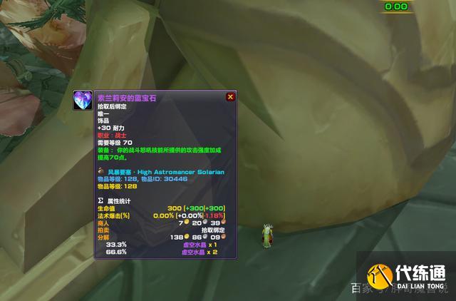 TBC版本P2阶段战士的饰品名为索兰莉安的蓝宝石,掉落于风暴钥匙的大星术师。索兰莉安的蓝宝石的主属性为30点耐力,使用效果为战斗怒吼获得70点额外攻强。