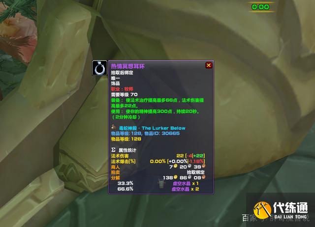 牧师的职业饰品名为热情冥想耳环,掉落于毒蛇神殿鱼拉斯,常驻属性为66点治疗效果,使用后获得300点精神,持续20秒,2分钟CD。