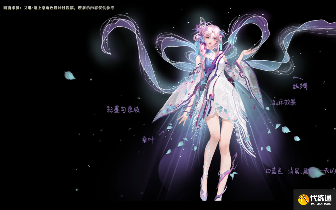 主色取自晨雾中桑树的白蓝色调,以桑果的紫红色作为点缀。艾琳身着轻罗薄纱,白色丝线环绕着裙摆,以桑枝勾勒轮廓,桑叶桑葚点缀其身,远观尤似身在清晨桑林的薄雾里。