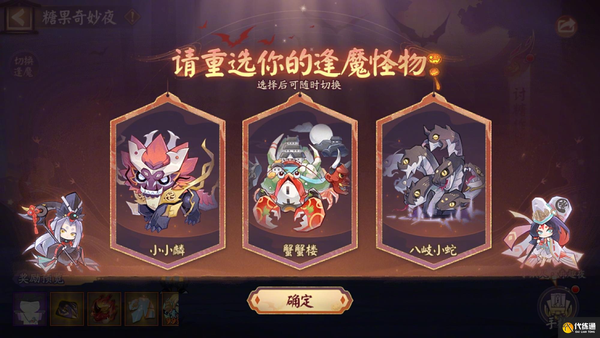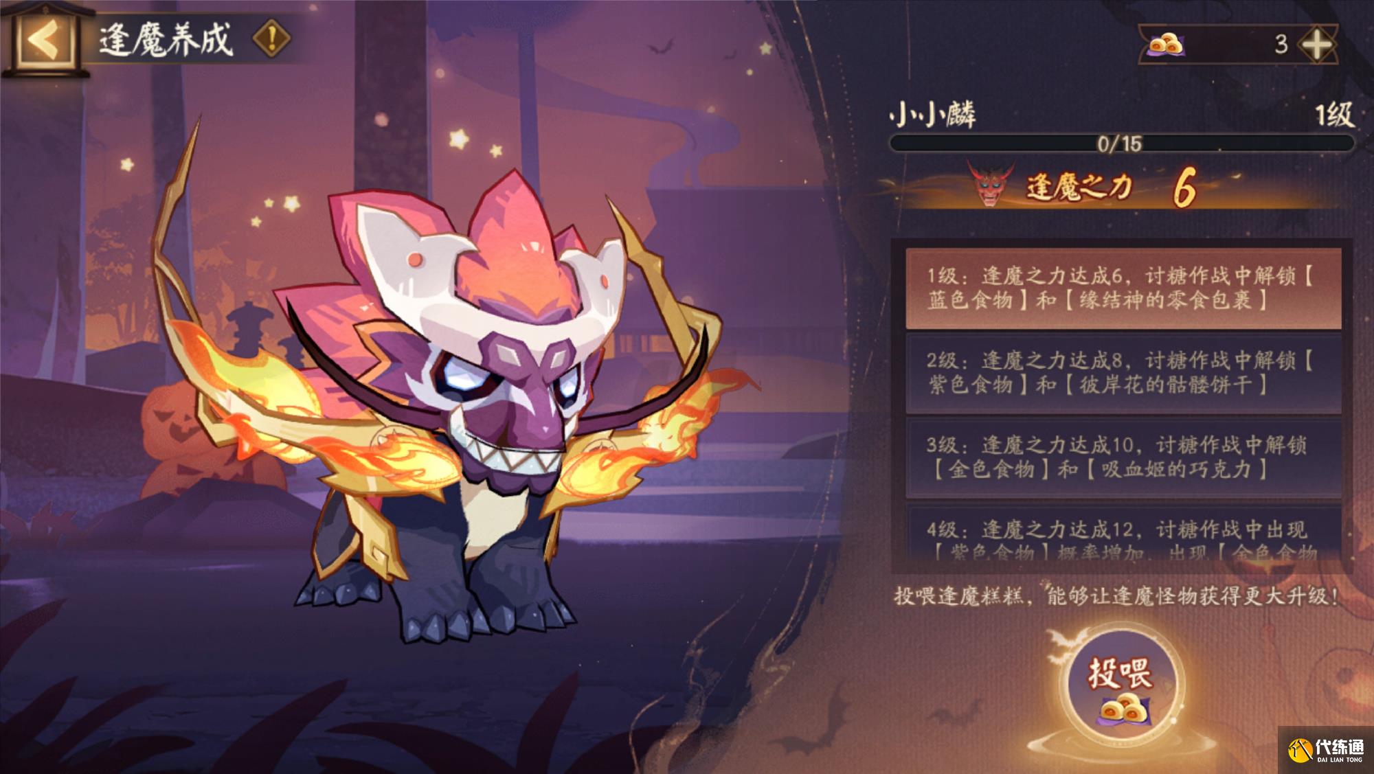 ※在活动期间,大人可选择八岐小蛇、蟹蟹楼和小小麟中一个逢魔怪物进行培养。大人完成每日任务即可领取「逢魔糕糕」和「奇趣糖糖」,向逄魔怪物投喂「逄魔糕糕」提升其逢魔之力,还可在「讨糖作战」玩法中解锁更多食物卡!