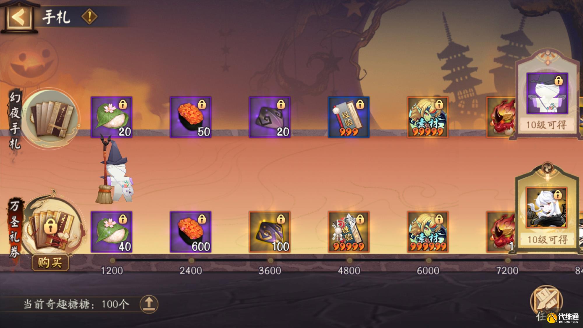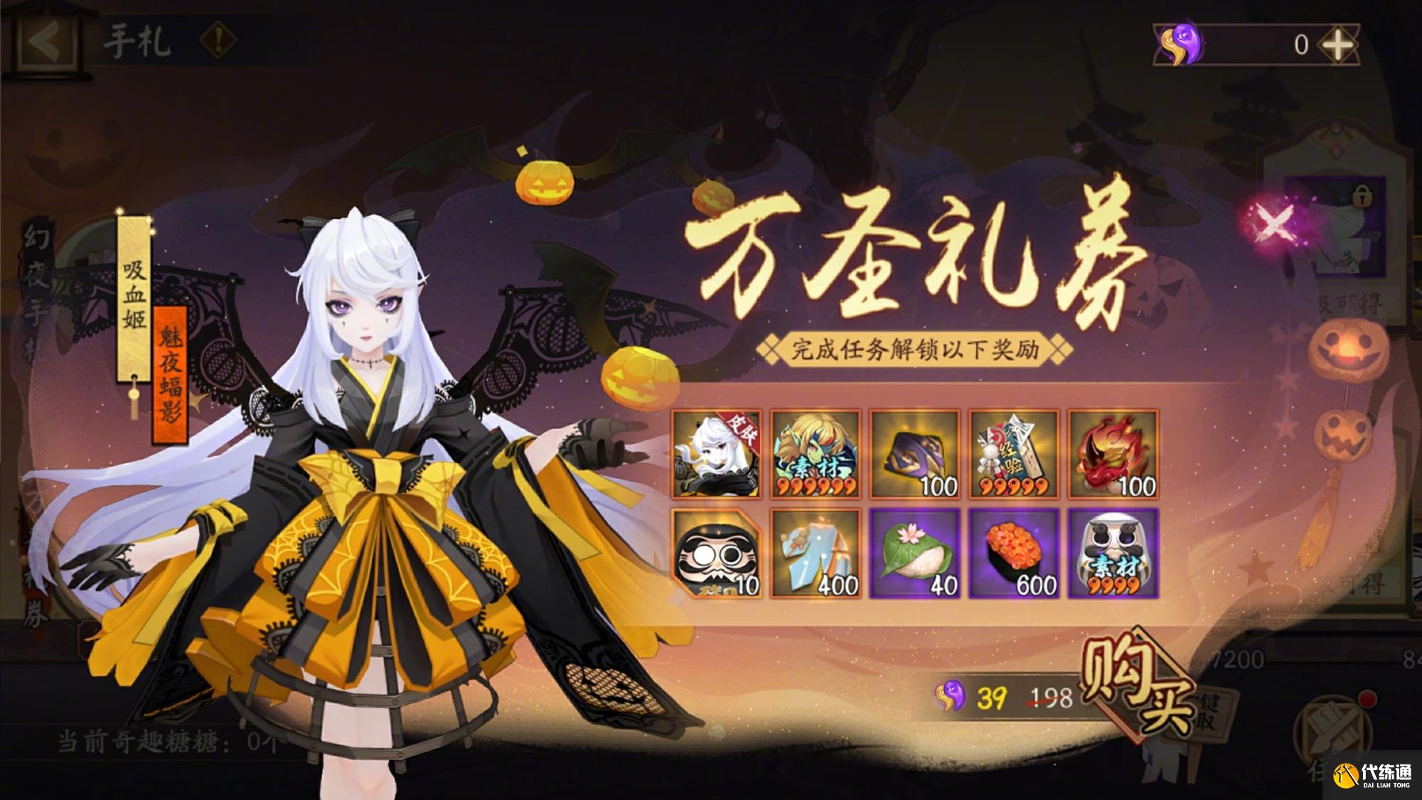 ※完成活动内每日任务与成就可获得「奇趣糖糖」,达到指定数量即可解锁手札中的奖励,领取万圣节主题小纸人皮肤「小纸人·奇趣夜」和成长道具奖励。大人也可购买「万圣礼券」解锁SR阶式神吸血姬新皮肤「魅夜蝠影」、四星奉为达摩、御行达摩碎片等更多奖励!