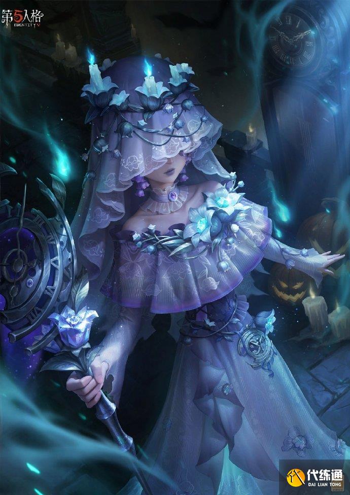 薄纱制成的露肩长裙如同重瓣的花朵,轻柔而神秘,破碎的裙摆闪烁着鬼火般的光晕,她的美丽让人不敢靠近。手杖顶端是一块表盘残缺的时钟,指针已失去行走的功能,停留在某个也许并无意义的时间。