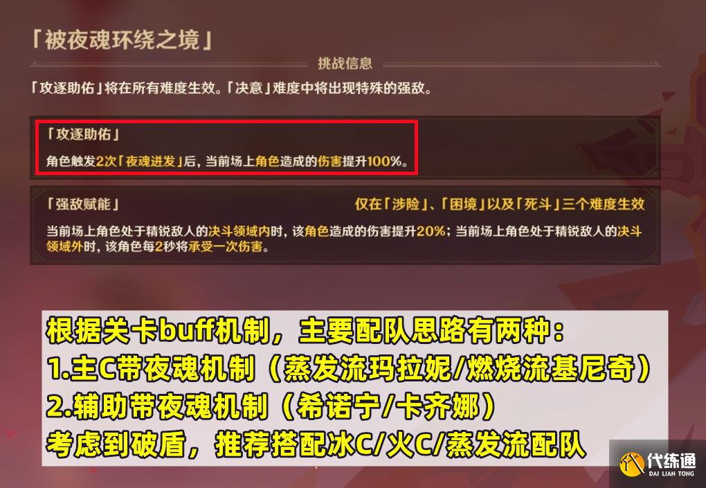 这一关的关键buff为触发两次夜魂迸发后,场上角色获得100%的增伤。