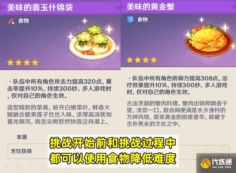 挑战开始前和挑战过程中都可以使用食物来降低难度;另外拿满原石奖励只需完成困境难度即可~
