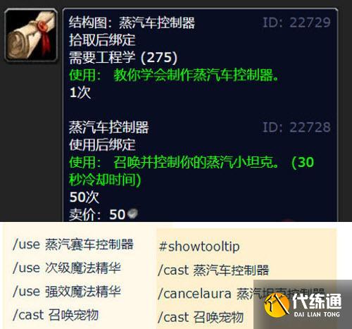 制作材料非常便宜,3个秘银锭和1个黄金能量核心即可。完成后这个道具可以使用50次,每次CD只有30秒,足够胜任每周的团本伐木或开荒攻坚。注意使用1次后该遥控器就与角色绑定了,刚做出来是可以交易的。使用后它可以召唤一辆小小的蒸汽坦克,闲暇之时还可以用来玩耍,实乃居家旅行必备玩具。