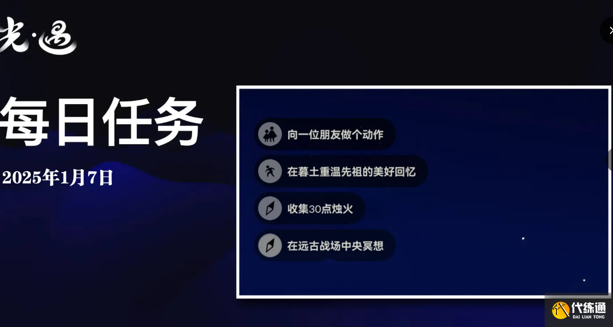 光遇今天的每日任务刷新在了暮土,大家知道今天1月7日的具体任务信息和做法流程吗?下面为大家带来光遇1.7每日任务怎么做的具体内容和方法,感兴趣的玩家们千万不要错过哦!