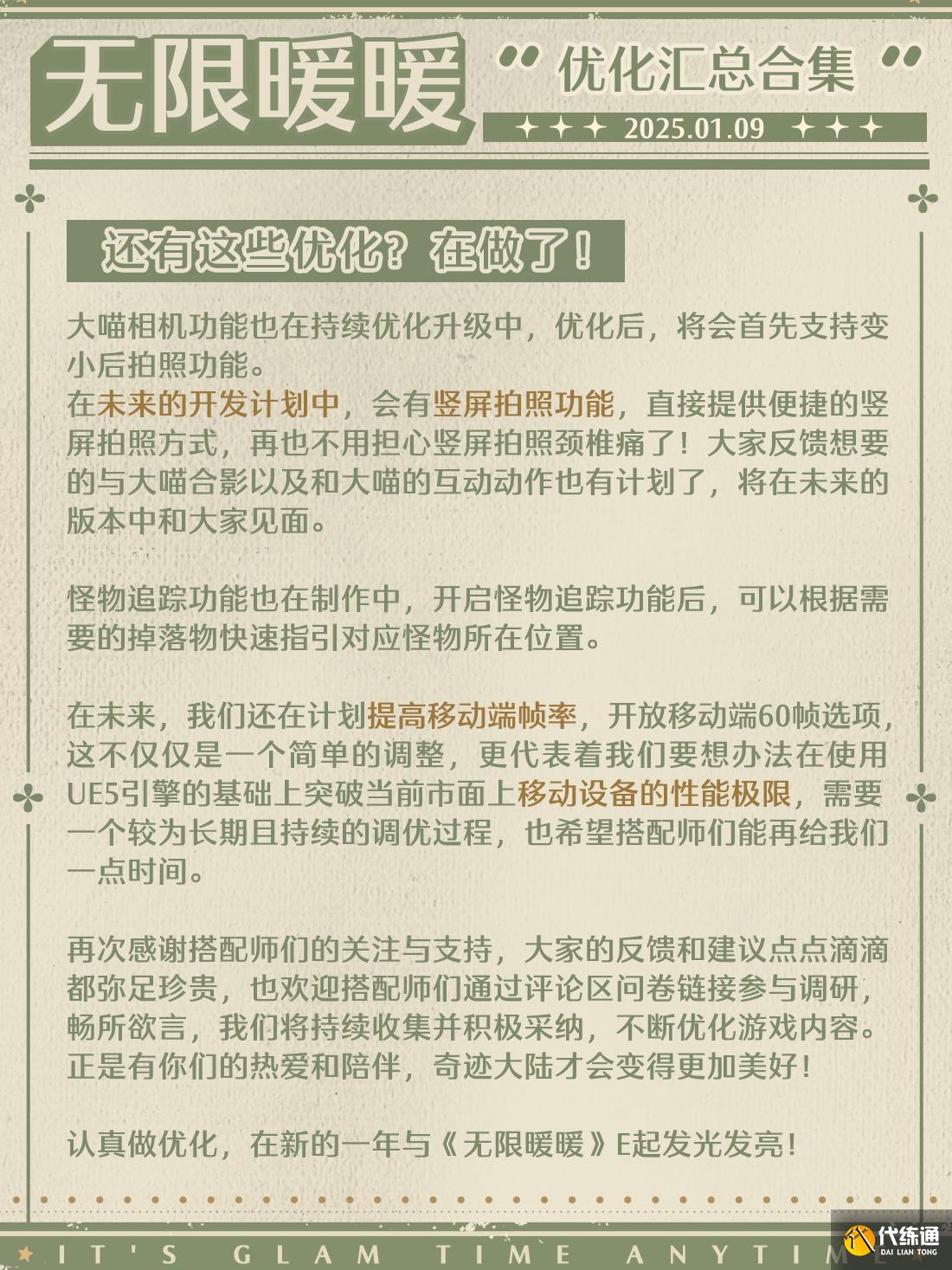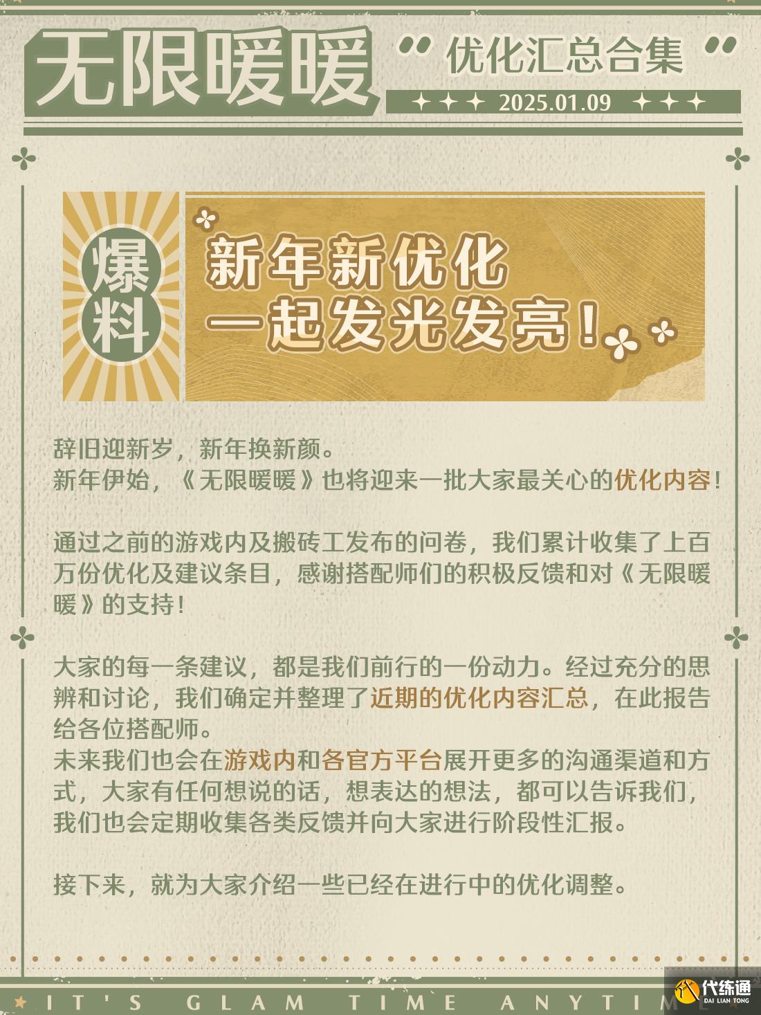 无限暖暖的新年优化相关内容已经正式公布了,大家在未来版本中就可以玩到更新后的内容了,下面为大家带来的具体内容,感兴趣的玩家们千万不要错过哦!