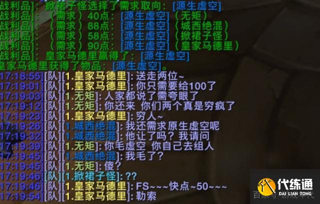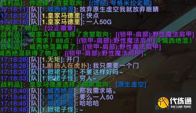 事实上,这个队伍队长就是法师,组人时特意在喊话中注明,自己是需求夸眼,来不竞争的职业,所以最后DPS是法猎贼。然而他肯定想不到,正是这个不可能需求法系饰品的盗贼,联合治疗一起黑走了装备,还向自己要金。猎人看不过去,批评盗贼和萨满,人家本来开组就是冲着夸眼来的,事先也说好了,你们还整这一出真是穷疯了。结果萨满理直气壮地表示,我还需求虚空呢,这法师也没让啊。法师直接打出问号,这萨满进组压根也没提这回事,现在的人都这么自我吗?