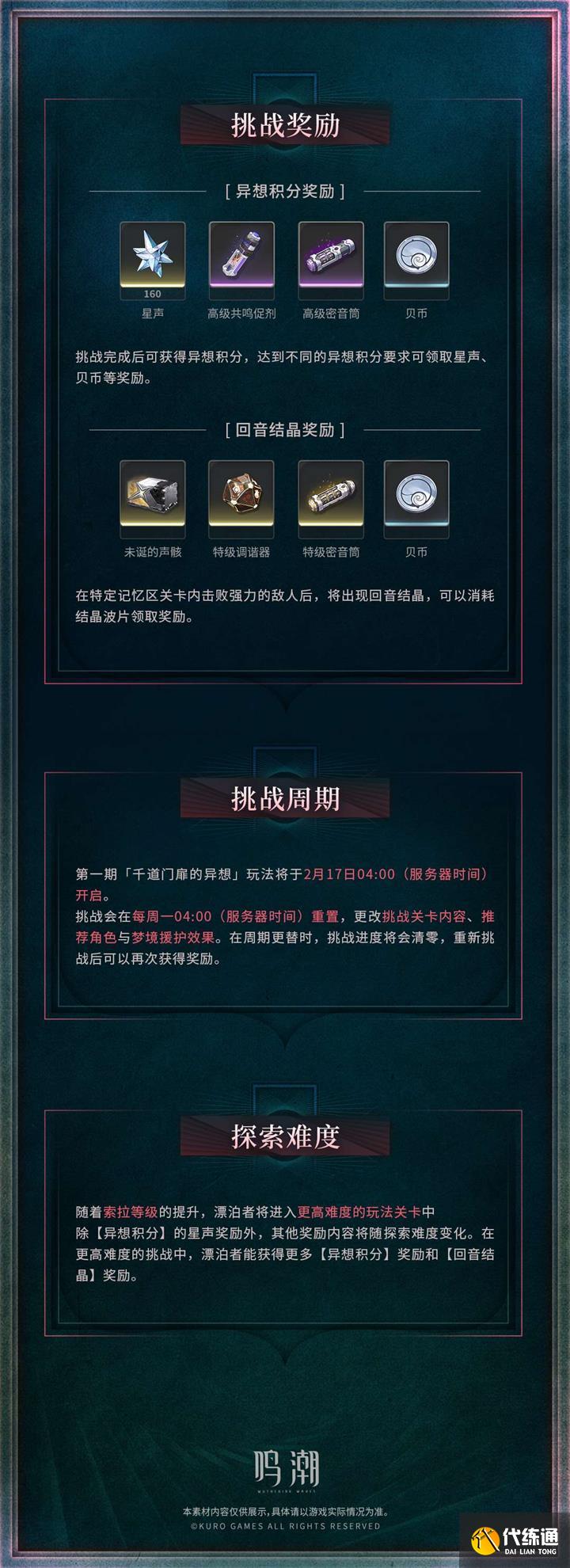 首期“千道门扉的异想”将于2月17日04:00(服务器时间)正式开启,每周一会定期重置挑战内容。随着索拉等级的提升,玩家将面临更高难度的挑战,同时也能获得更多异想积分和回音结晶奖励。