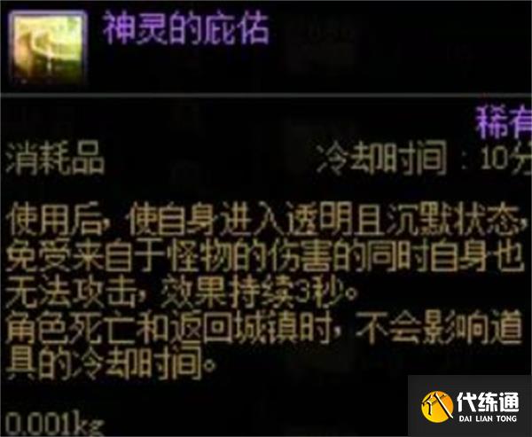 该装备使用后能够让角色进入3秒的无敌状态。这个短暂的无敌时间可以帮助你规避一些高伤害技能,增强战斗的容错率。