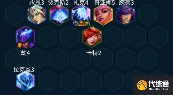 该阵容以【劫】作为核心输出,搭配电子舞曲与音浪刺客激活双重爆发效果,前排由扎克等格斗棋子抗伤,拉克丝补足群体伤害。