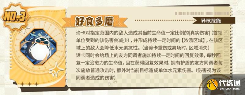 该技能对敌人造成基于生命值的真实伤害(对首领效果减弱),同时创造"浓汤区域"。区域内不仅削弱敌人水抗,还能持续治疗友军。带护盾的队友在区域内普攻会附加水伤,形成攻防一体的战斗领域。