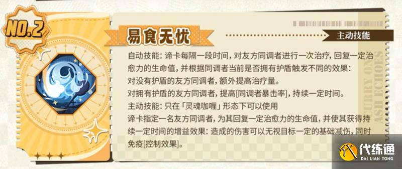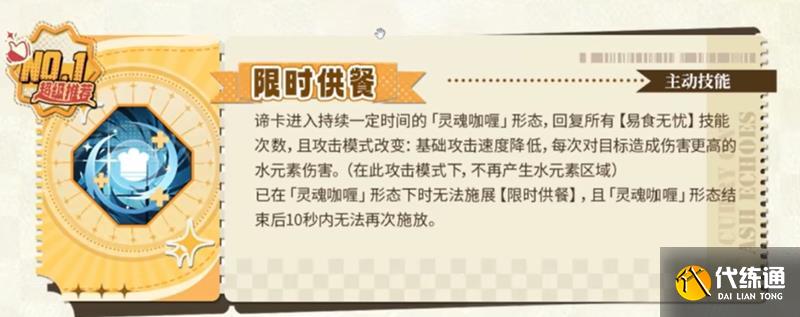 主动技能"限时供餐"能立即切换至灵魂咖喱形态并刷新治疗技能,是扭转战局的关键。自动技能"易食无忧"则根据队友状态智能调节效果:无护盾时提供强力治疗,有护盾时则提升暴击率,完美兼顾生存与输出需求。
