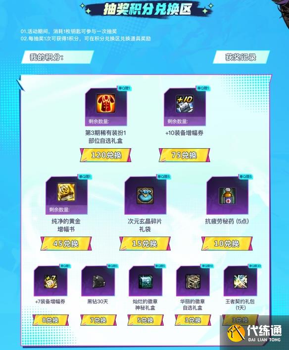 5、玩家可以用抽奖获得的积分去兑换奖励,如+10装备增幅券、黄金增幅书。