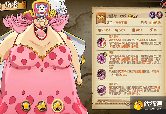 大妈和凯多是比较相近的一张卡,都是又能抗又能输出的,大妈在天梯中的位置就相当于之前黑胡子的位置,有这张卡肯定也是必定要练的,剧情中也是少不了大妈的一个抗伤害的能力,以及他的输出也是不能小视的,这张卡我也是觉得必养的