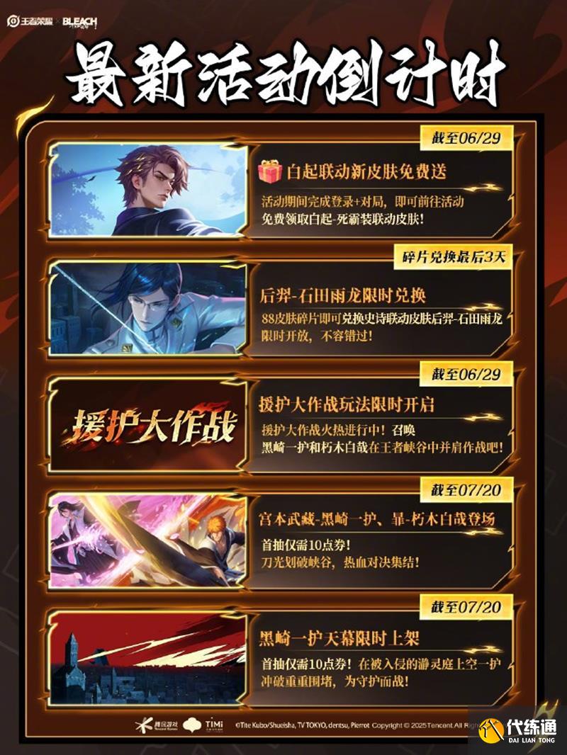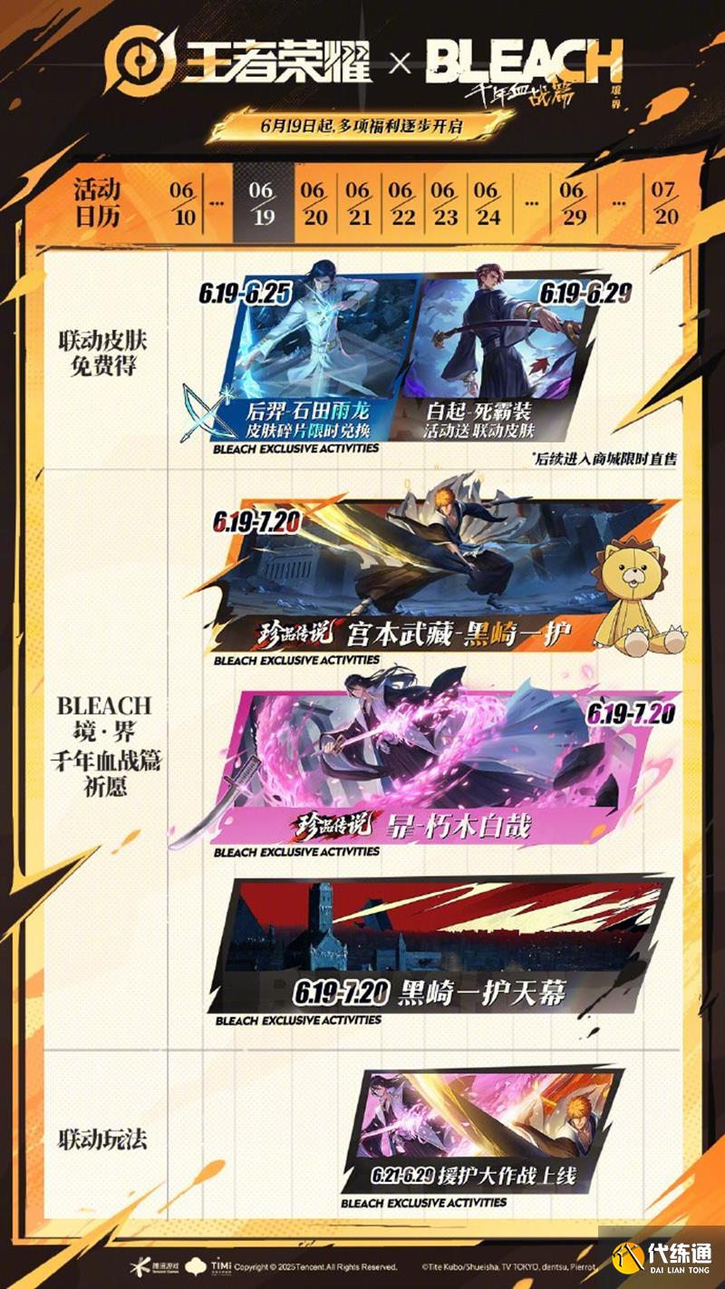 王者荣耀与BLEACH境·界千年血战篇的联动活动已经开启,为召唤师们带来了丰富的游戏内容和福利。活动时间从6月19日逐步开启,一直持续到7月22日。在这段时间内,召唤师们可以参与祈愿活动,有机会获取王者荣耀x BLEACH境·界千年血战篇正版联动皮肤、天幕等珍贵奖励。