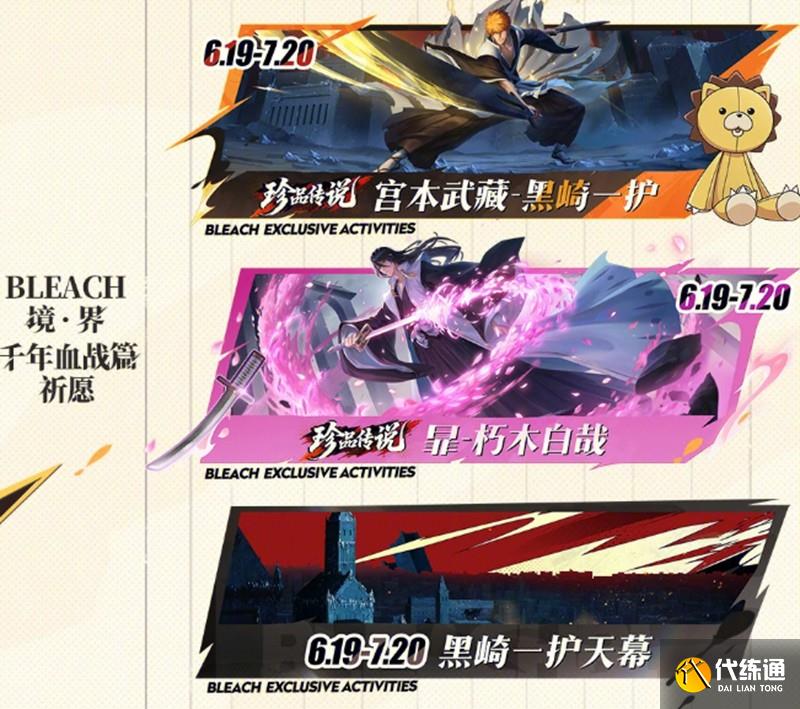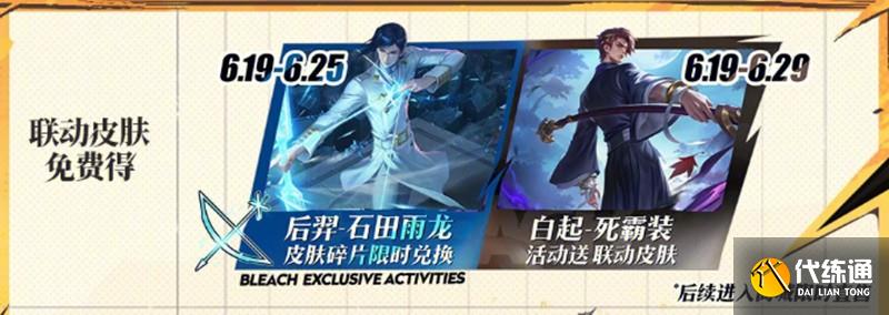 宫本武藏的黑崎一护和暃的朽木白哉这两款传说品质皮肤可以通过"BLEACH祈愿"活动获取,活动时间为6月19日至7月20日。后羿的石田雨龙皮肤将在上线首周开放88皮肤碎片兑换,而白起的死霸装可以通过参与联动玩法获取积分兑换,6月30日后也可以用488点券直接购买。