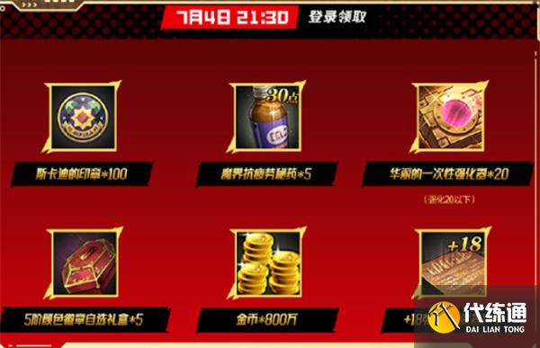1、7月4日21点30分登录游戏,即可领取1张+18武器强化券、100个斯卡迪印章、5个30点疲劳药、20个一次性强化器、800万金币、5个5阶颜色徽章自选礼盒